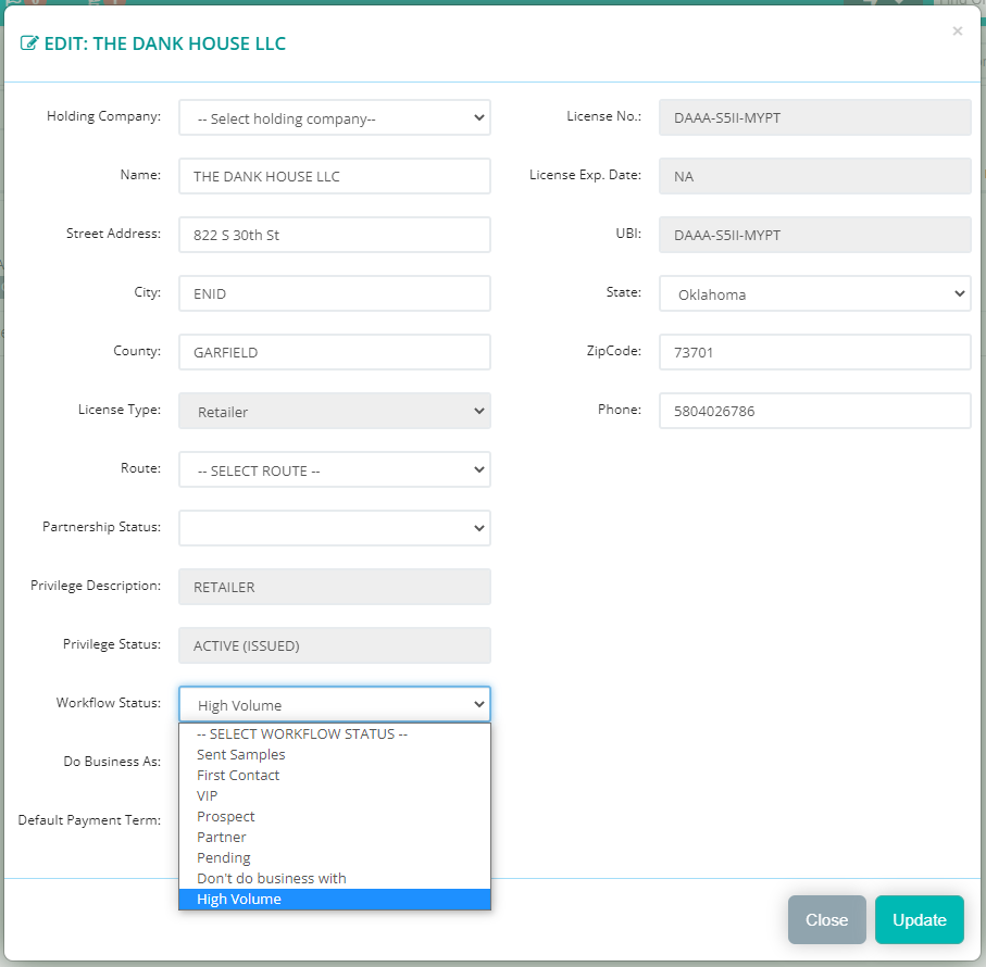 A status can be assigned to the “Workflow Status” field, which can be accessed by right-clicking an Account and choosing “Edit Account”.