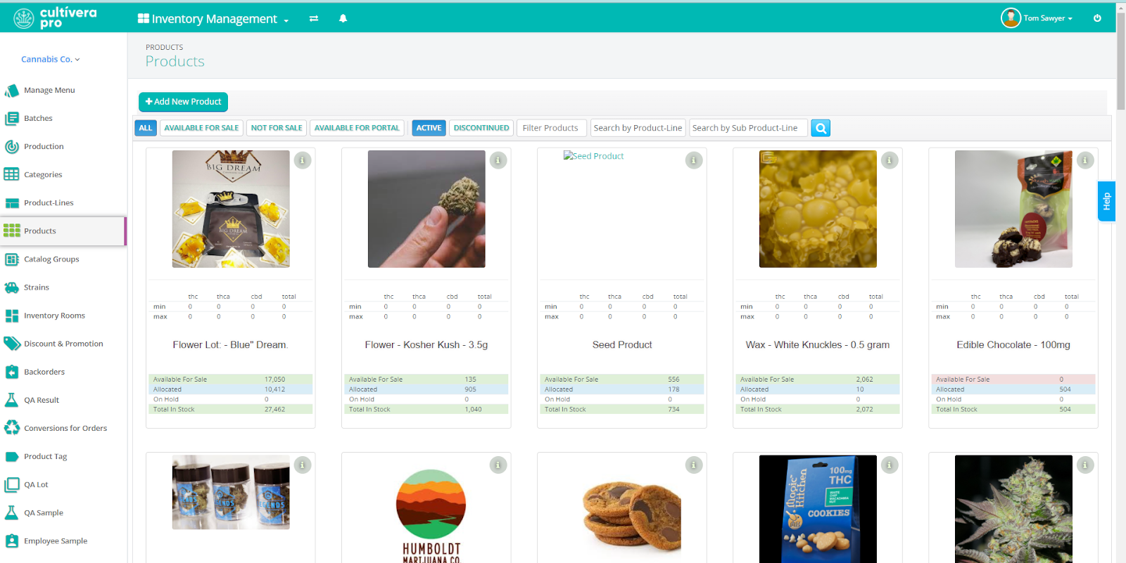 The Inventory Management > Products tab shows a catalog-style view of existing products, including images, test results, and inventory information for every product in your Cultivera PRO system.
