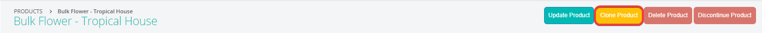 - Once on the Product Detail page, you can Select the yellow “Clone Product” button in the top-right (pictured below) to start a “New Product” creation.