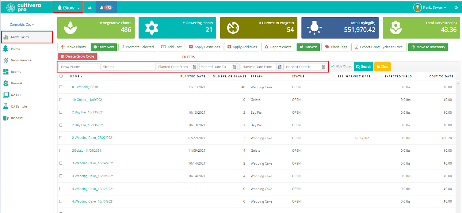Hint: Use the filters near the top of the screen to search for the grow cycle if needed.