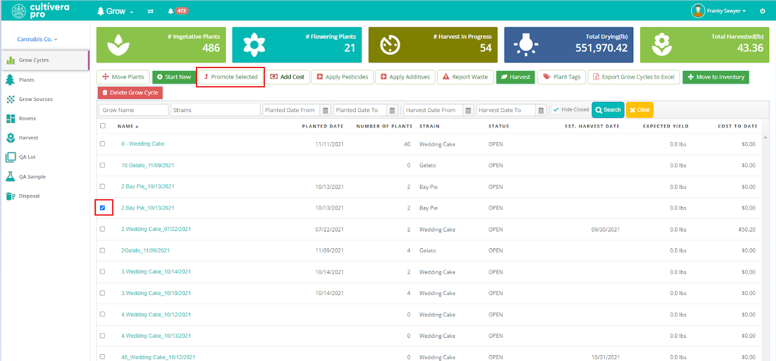 - Check the box next to the grow cycle and click the "Promote Selected" button.