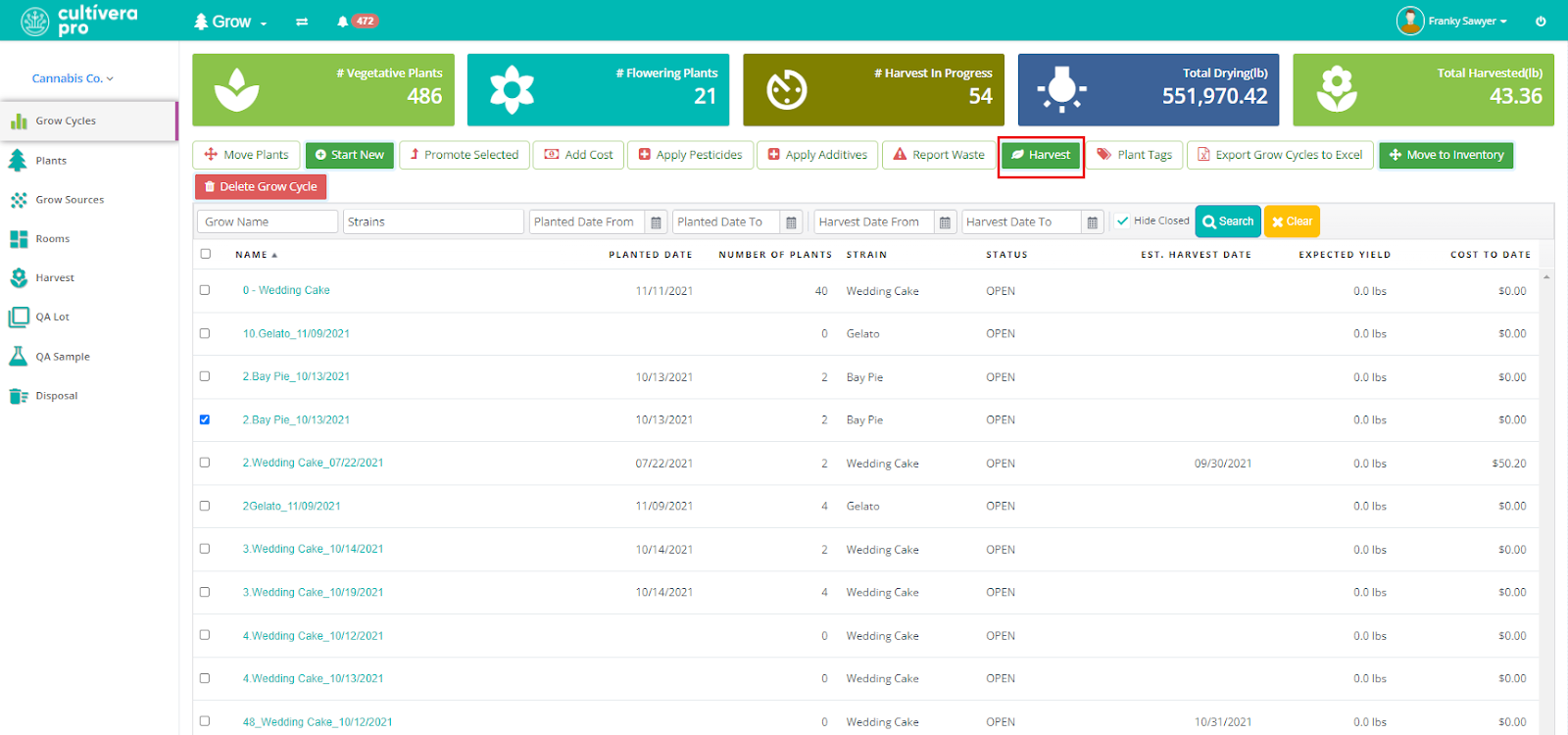 - Check the box next to the grow cycle that was just promoted to “Ready For Harvest” and click the “Harvest” button.