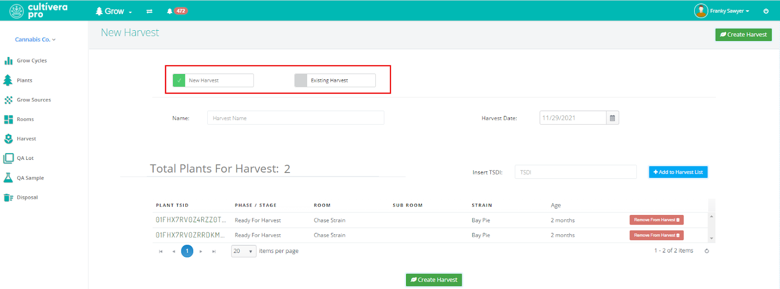 “New Harvest” will be selected by default, but if you are adding plants to an existing harvest click the “Existing Harvest” option.