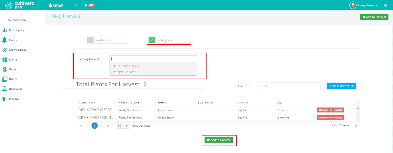 - If you are adding plants to an Existing Harvest of the same strain, you will select an existing harvest from the drop-down menu and click “Add to Harvest”.