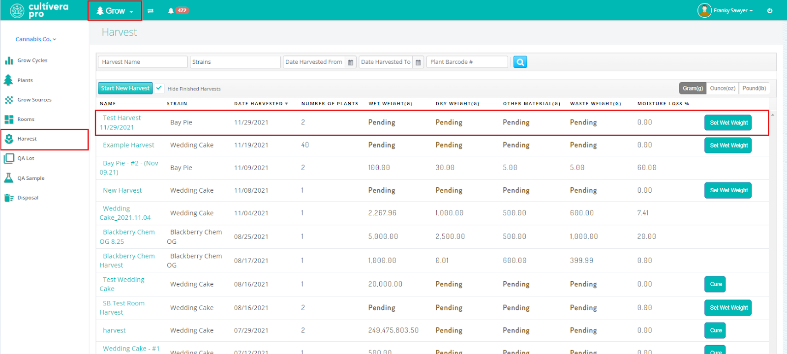 Follow these steps to create a Harvest from a Grow Cycle in the Cultivera PRO platform.