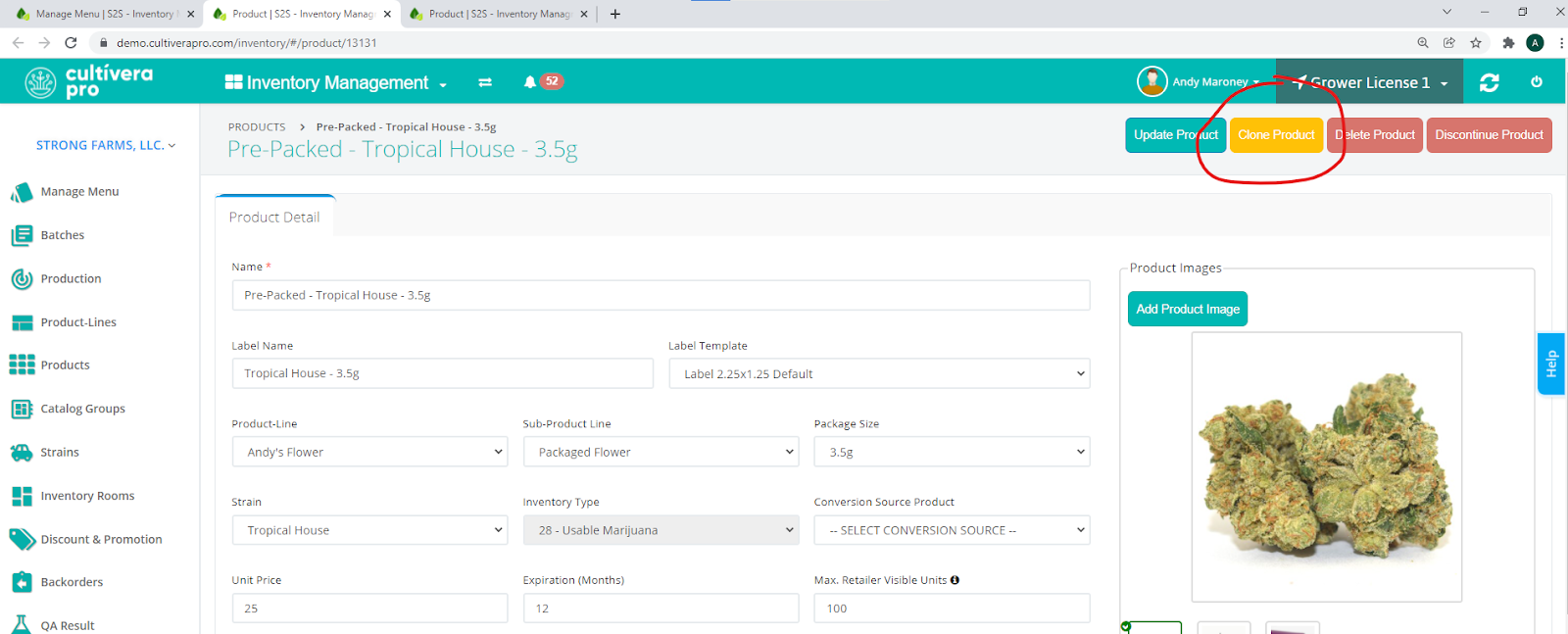 In the following graphic, we’ve highlighted the “Clone Product” tool, which will allow you to make a copy of the item, then replace the Strain name with the new one you’ve added to the system.