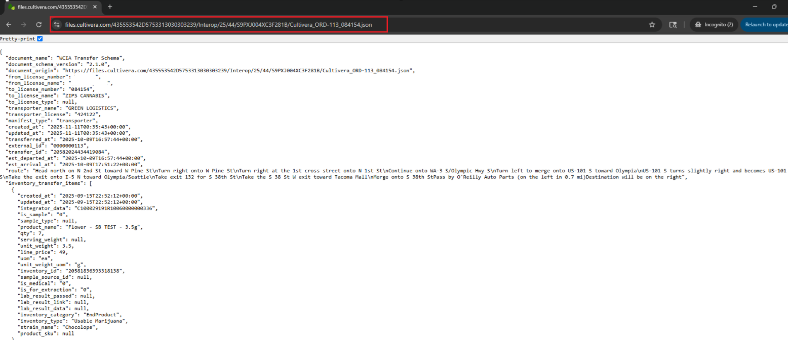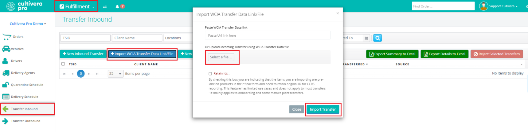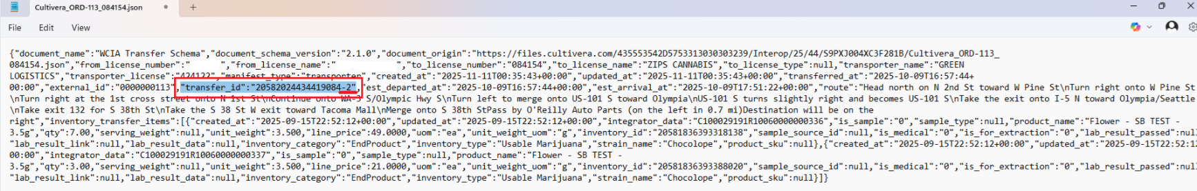 - The updated JSON File can then be used to import the transfer via Fulfillment > Transfer Inbound > "Import WCIA Transfer Data Link/File":