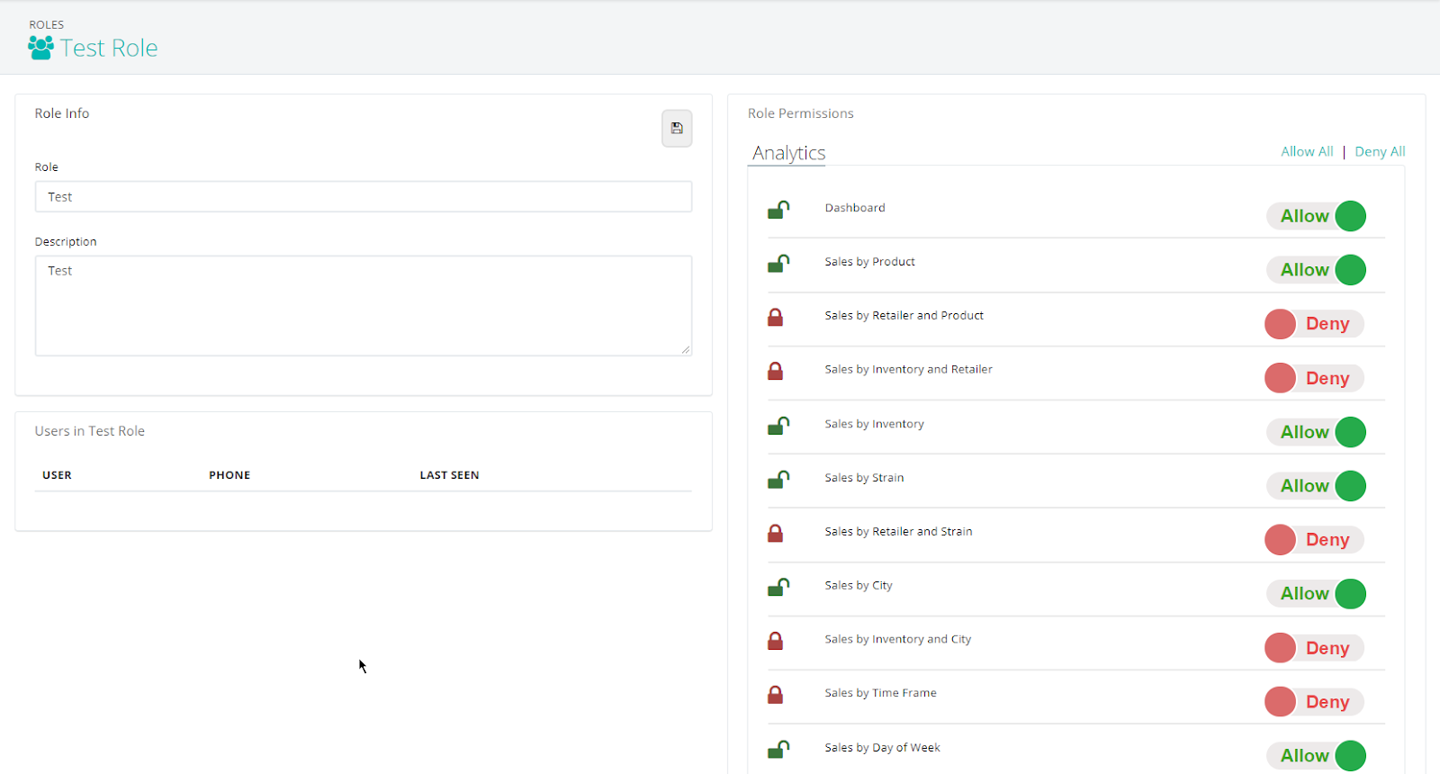 This will determine what aspects of the system users in this role will be allowed to access. New roles have all permissions set to “Deny” by default.