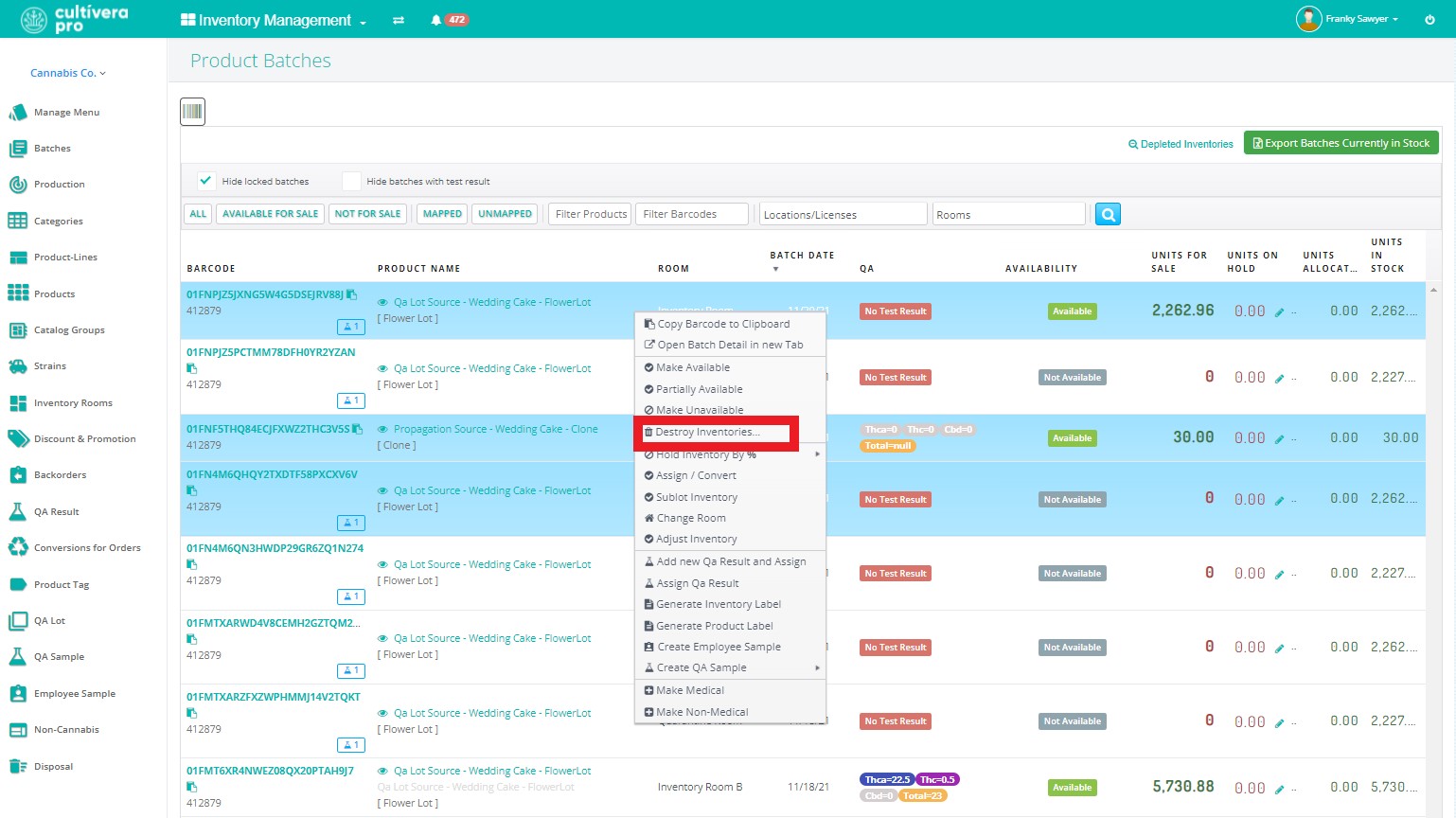 - Locate and highlight the inventories you wish to destroy from the Batches list.