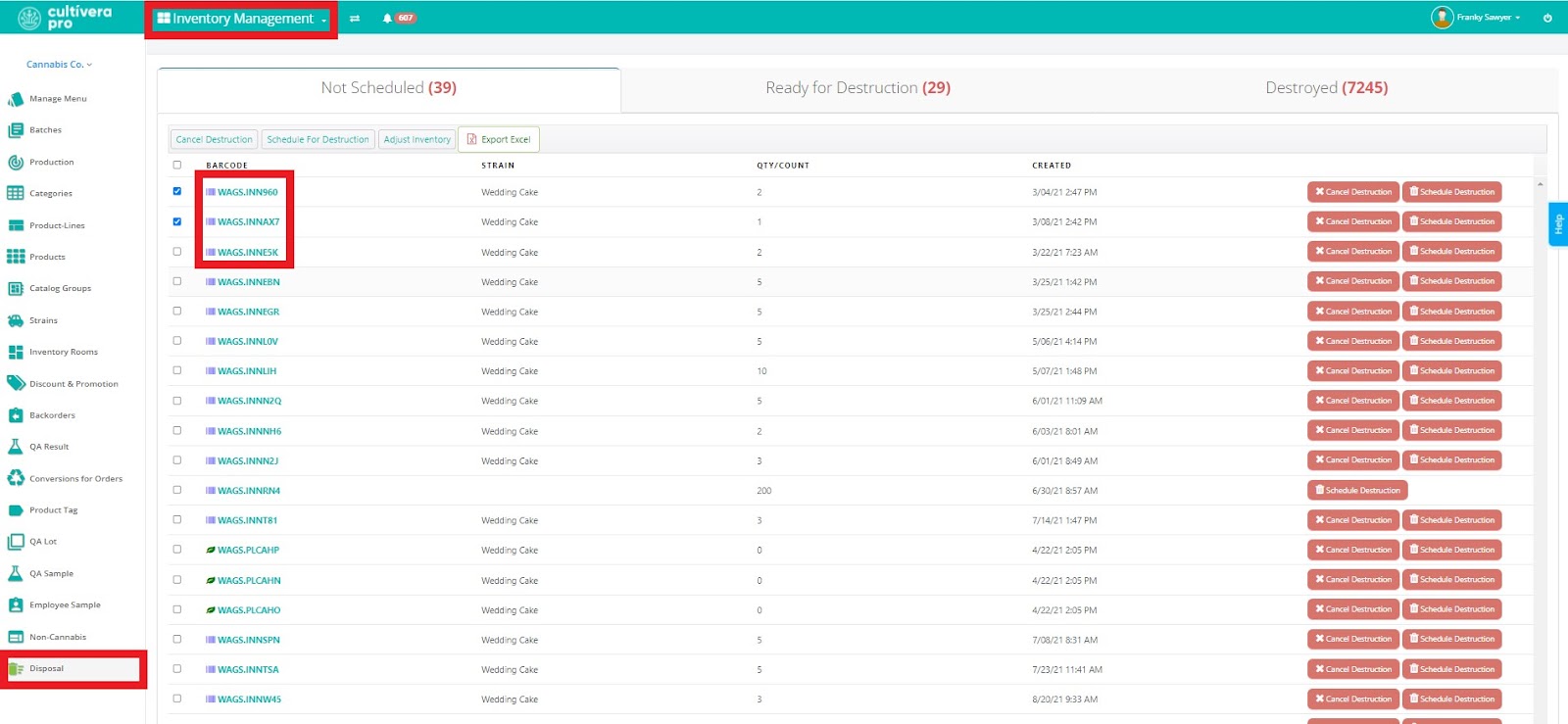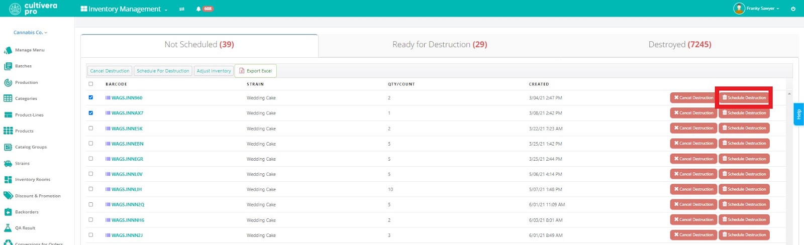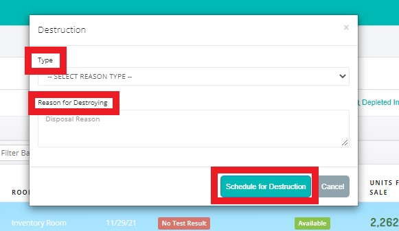 - Not Scheduled - plants and inventories not yet scheduled for destruction. During this stage of the destruction process, users may generate compliance tags, cancel a destruction, and modify the quarantine schedule.