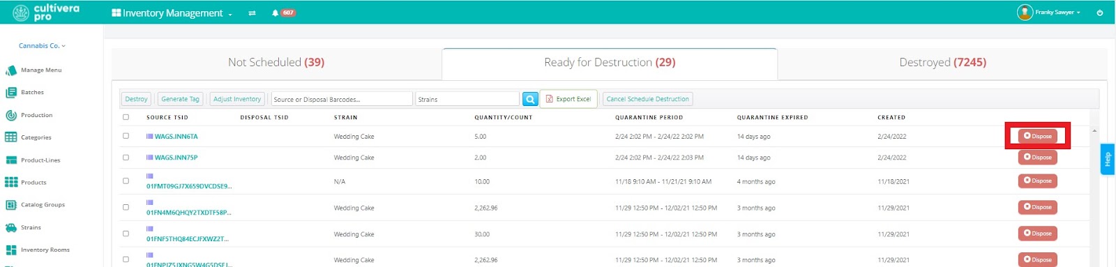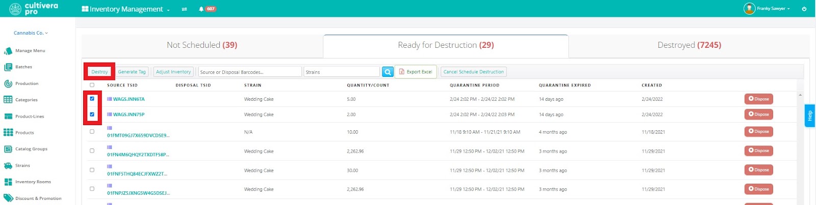 - Ready for Destruction - when plants and/or inventories have passed their quarantine period they will transition to the “Ready for Destruction” tab where users can generate compliance tags, cancel destructions, and ultimately execute the destruction of selected plants/inventories.