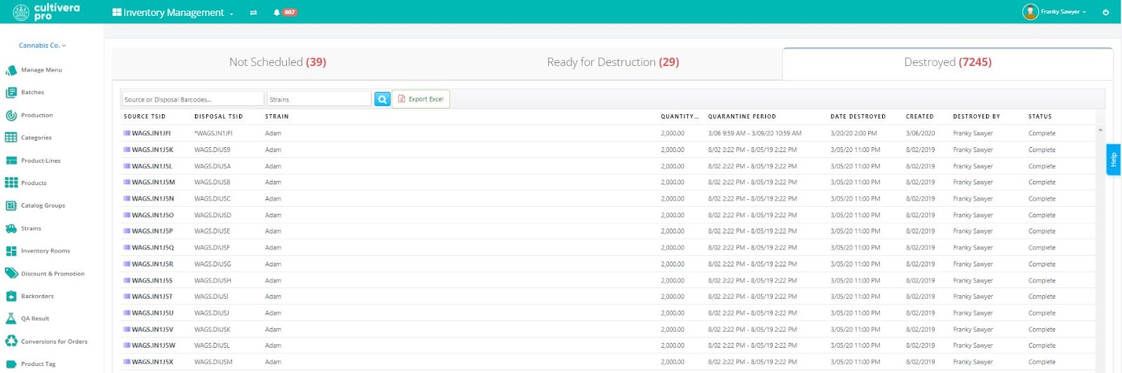 - Destroyed - upon destruction, plants/inventories can be viewed in the “Destroyed” tab.