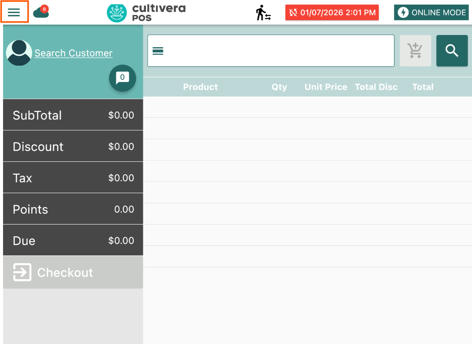 - On the Cultivera POS app, select the menu button.