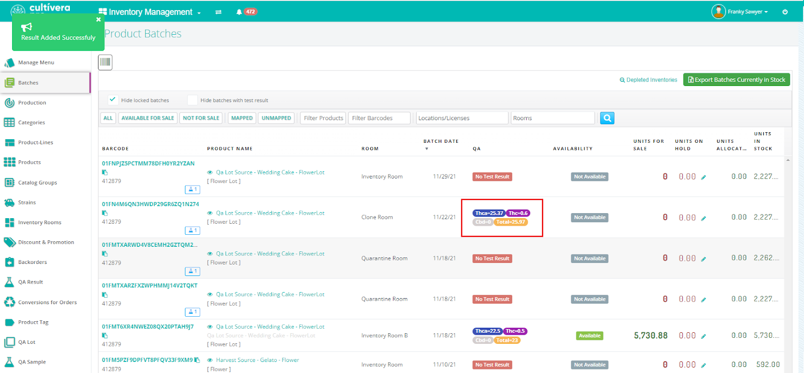 Once the QA Result has been added and assigned to the intended QA Parent batch, the result can then be found under Inventory Management > QA Result. This is where you can right-click on the Result to add Terpenes, set farm info, or add the COA PDF file to the result.
