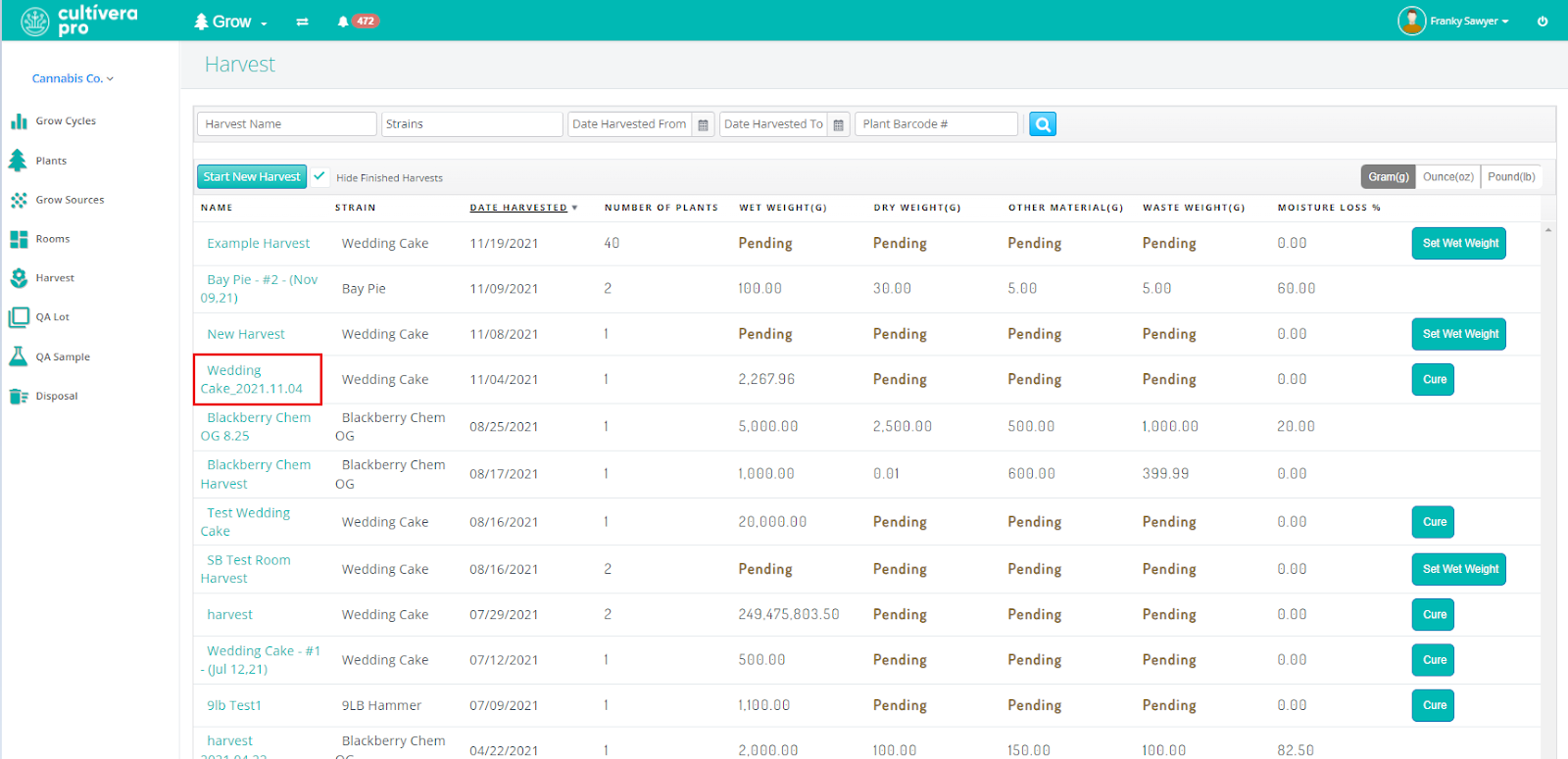 - Navigate to Grow > Harvest. Click on the name of a Harvest to navigate to the Harvest Detail page:
