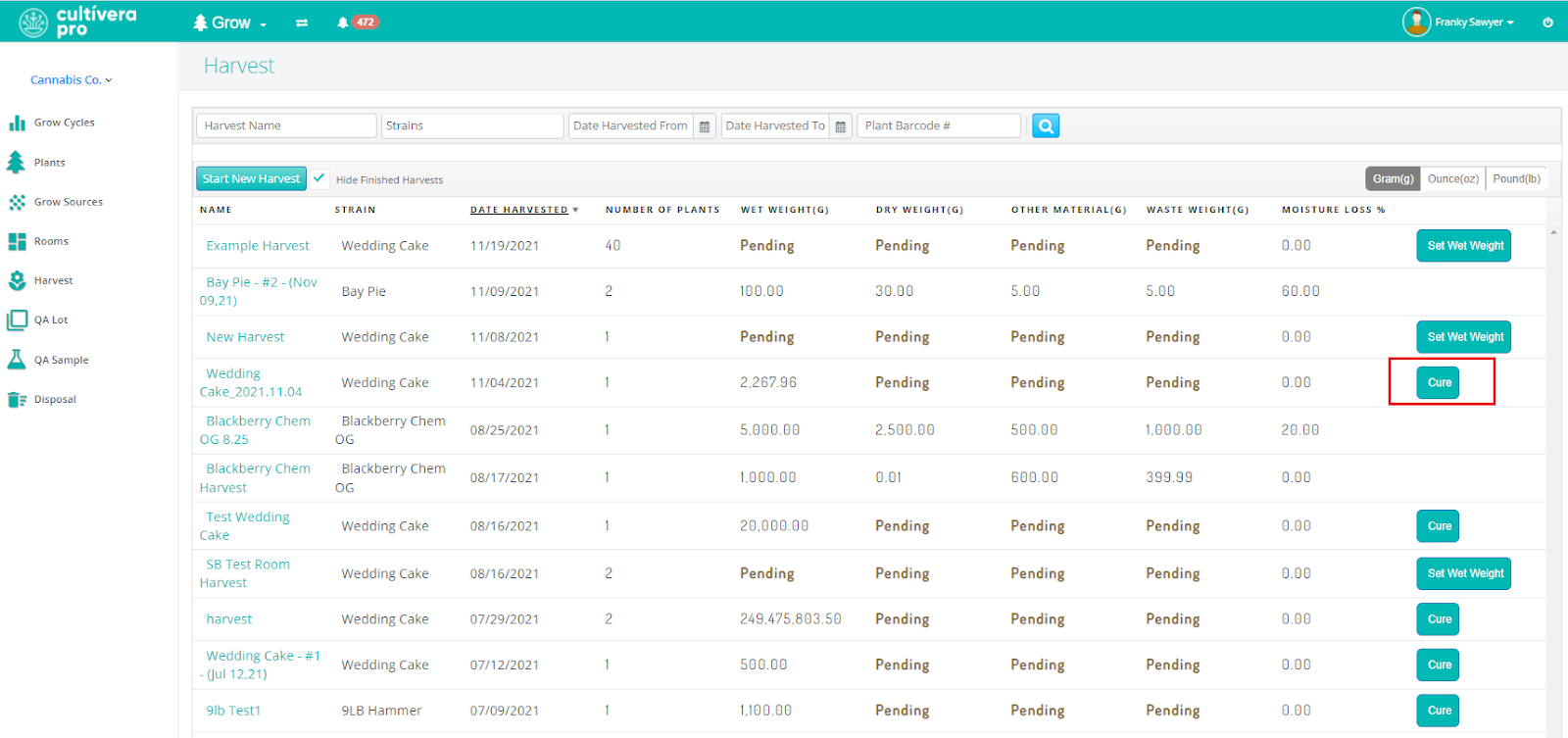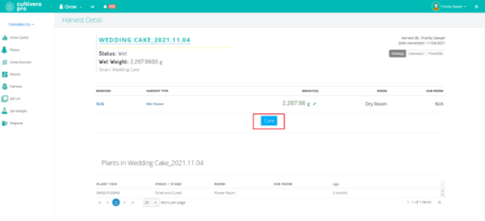 Alternatively, you can click the "Cure" button associated with the Harvest, directly from the Harvest page: