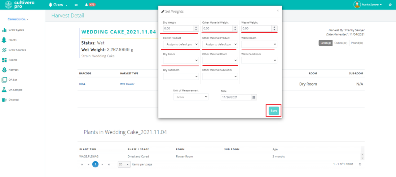 - Enter the "Dry Weight" and associated flower Product and Room. If applicable, you can also enter the "Other Material Weight" and “Waste Weight” before selecting “Save”.