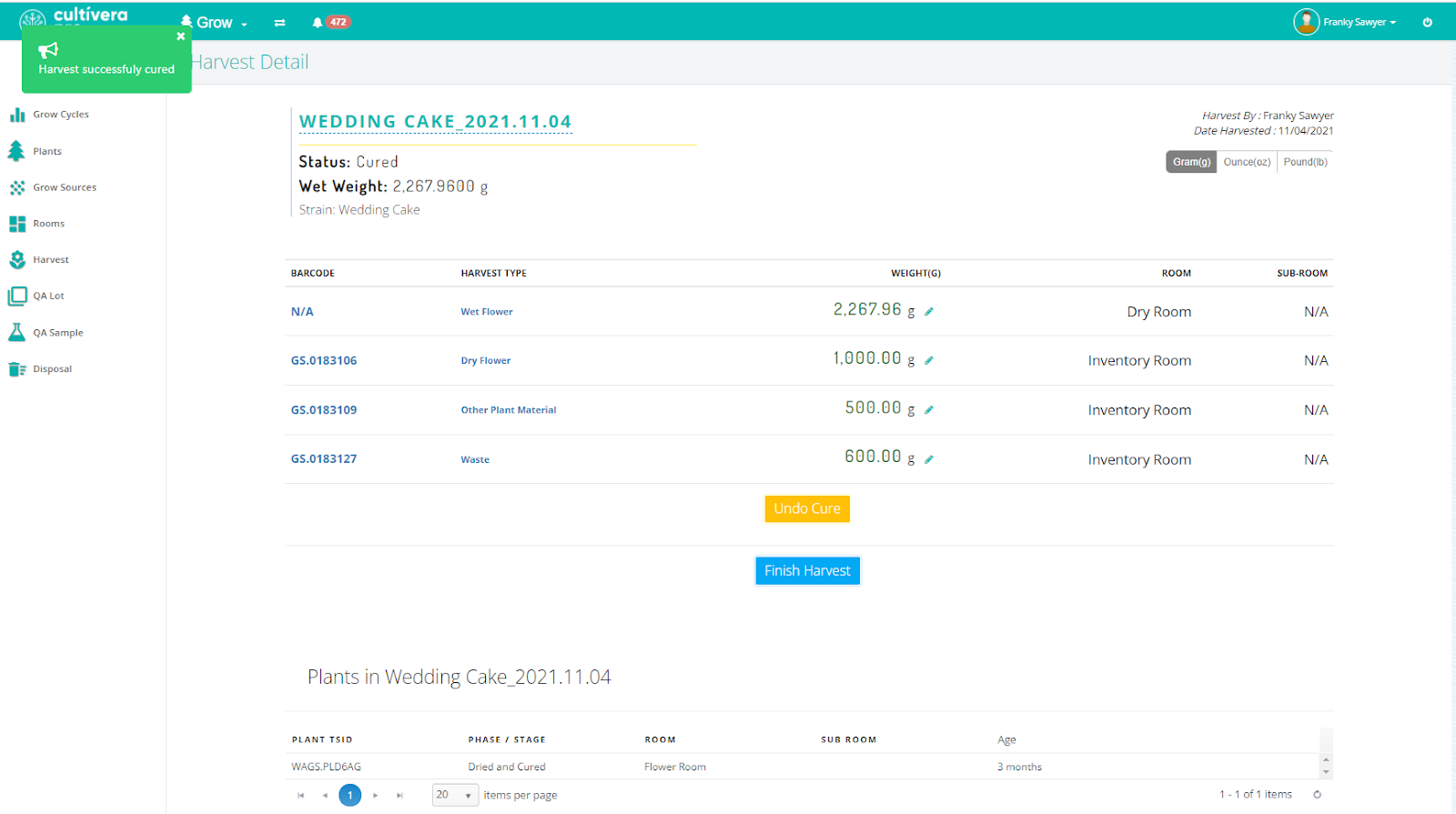 - You will see a success message once the Cure is complete, and the corresponding weights will be recorded. From the Harvest Detail page, you will also see the Barcodes generated for any Weights entered, as well as their corresponding Room: