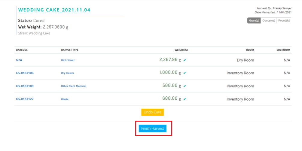 - Once all of the dry weights have been recorded for the harvest, select “Finish Harvest”