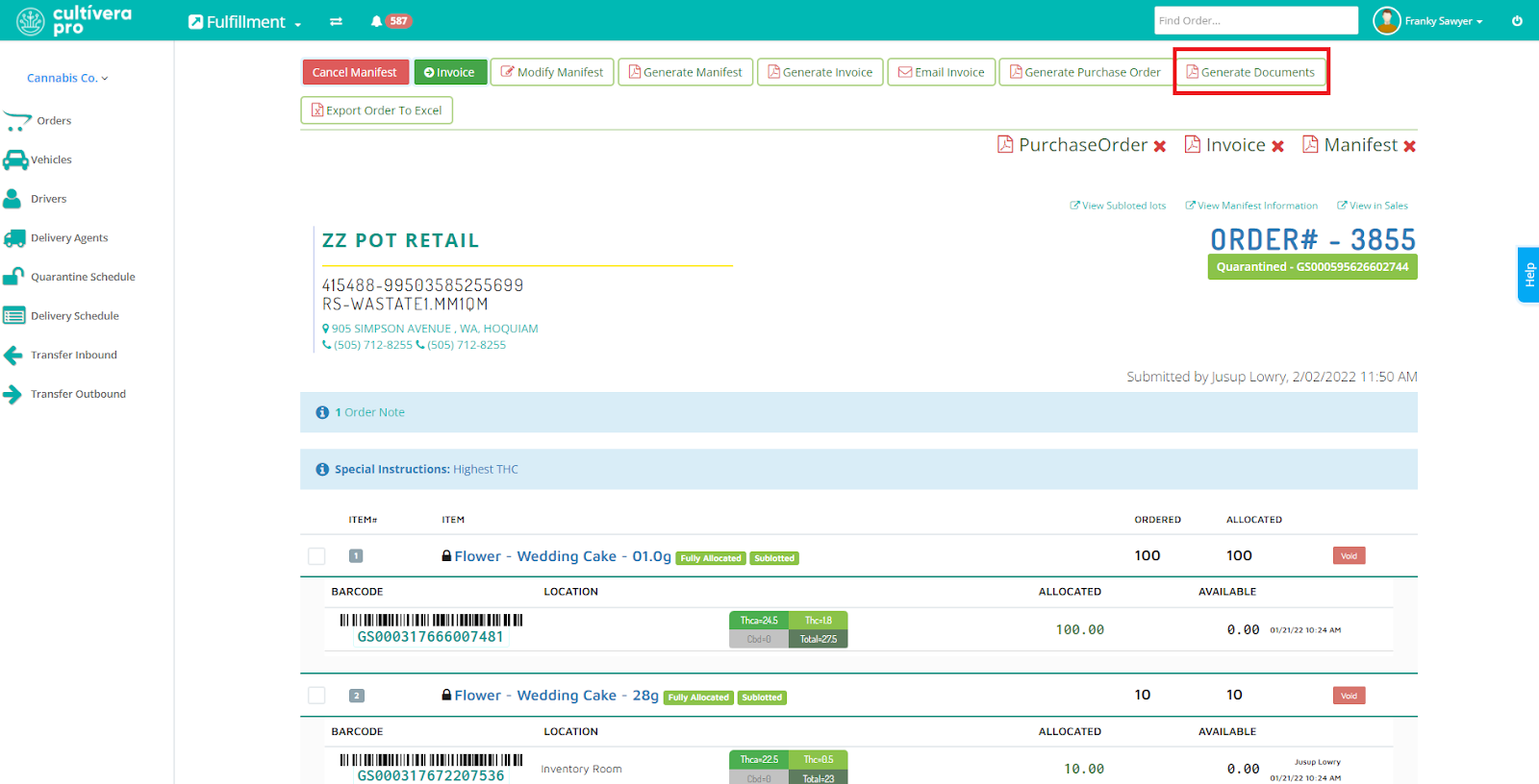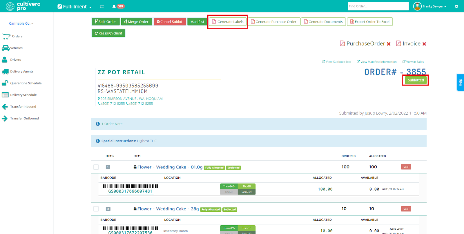 After an Order has been Sublotted, a “Generate Labels” button appears at the top of the page.
