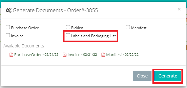 - Select “Labels and Packaging List” to generate (or re-generate) Product Labels for the Order:
