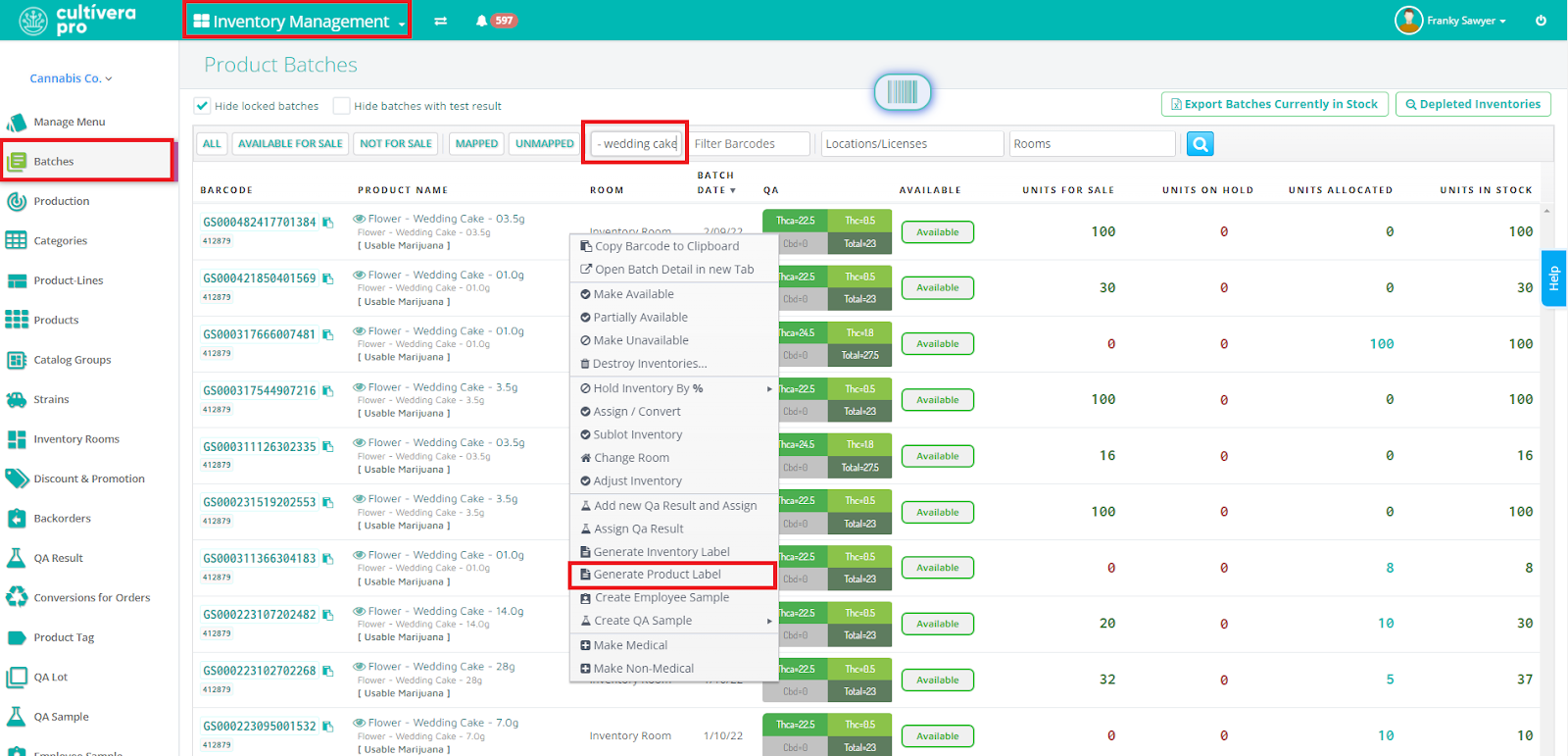 Product Labels can also be generated prior to the order fulfillment process for pre-labeled items by navigating to Inventory Management > Batches, filter to your intended Batch or Product, then right-click and select “Generate Product Label”.