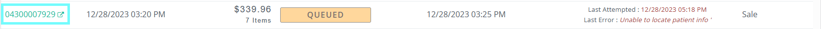 If a transaction has been completed but shows a "Queued Status" in the Compliance module along with the error "Unable to locate patient info," it means a patient was not assigned to the transaction and the transaction has not been reported to Metrc.