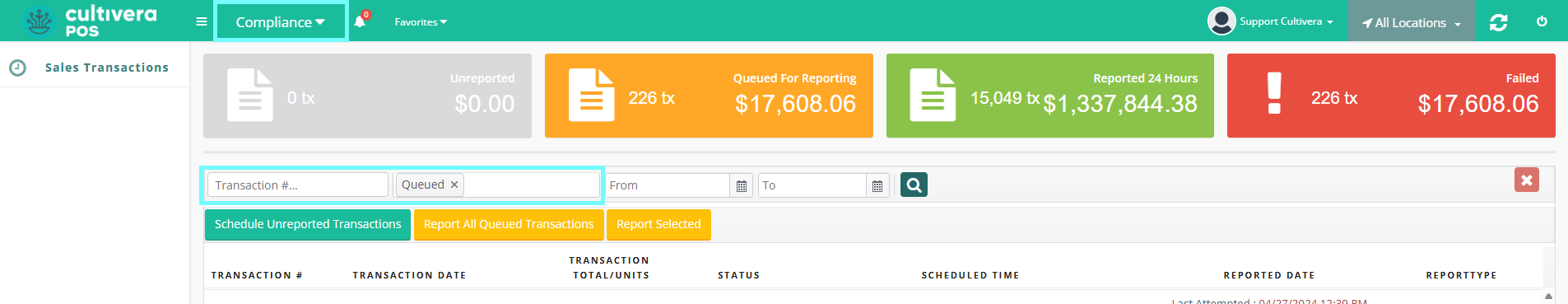 - Locate the transaction within the Compliance module utilizing the provided filters, filtering by "Queued".
