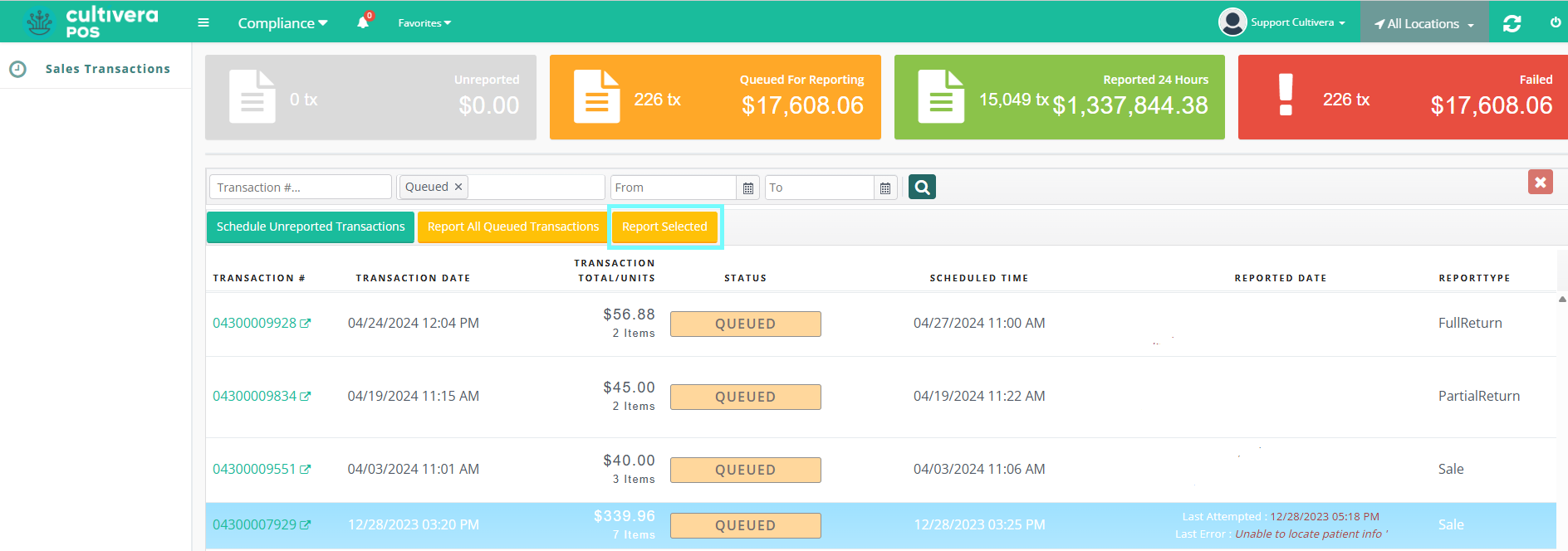 - Once the transaction has a patient assigned to it, it can then be re-reported to Metrc within the Compliance module.