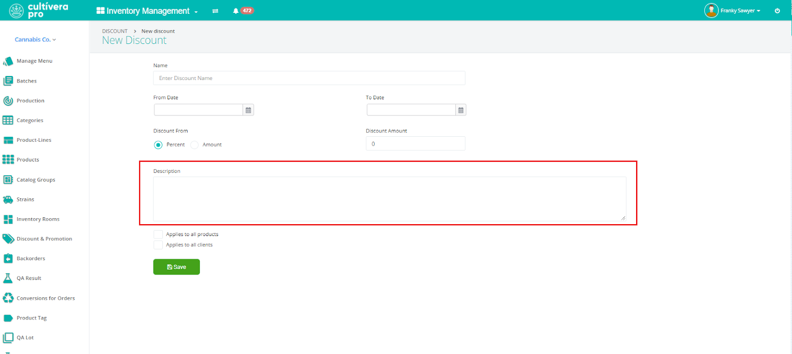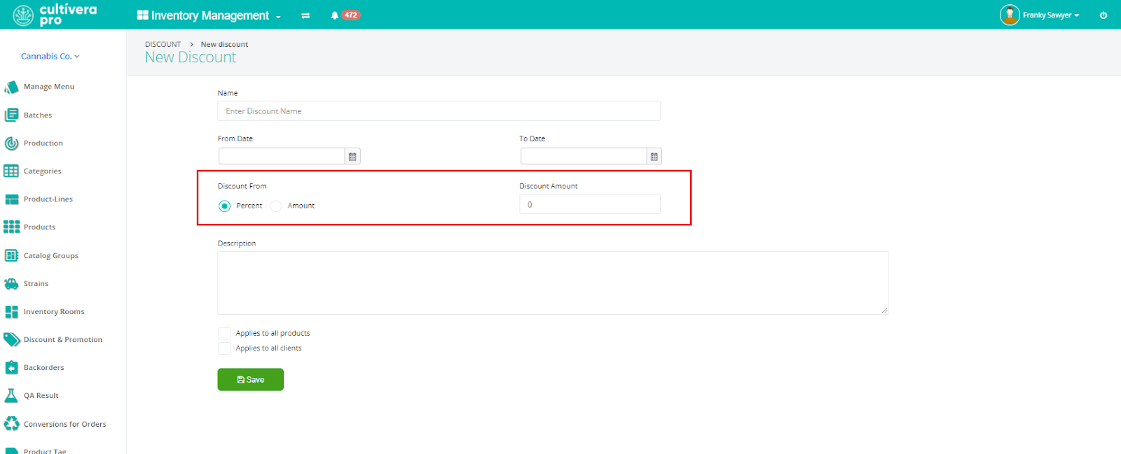 - Select whether to apply the discount to all products and/or all clients.