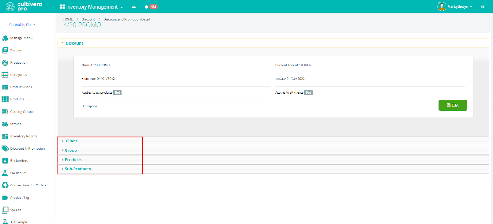 Note: In this example, we left both boxes unchecked in step 5 - this way all options are available for us to setup the discount/promotion. You can click into each field (Client, Group, Products, Sub-Products) to add specific Products, Clients, etc to the Discount & Promotion.