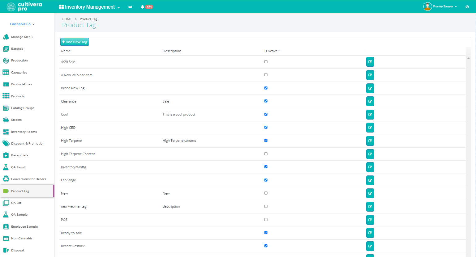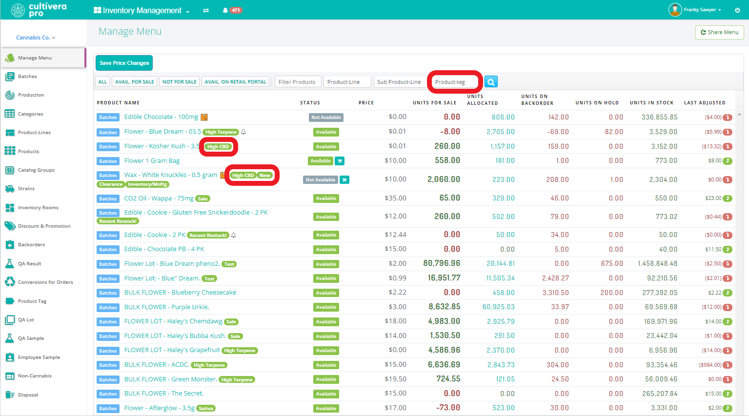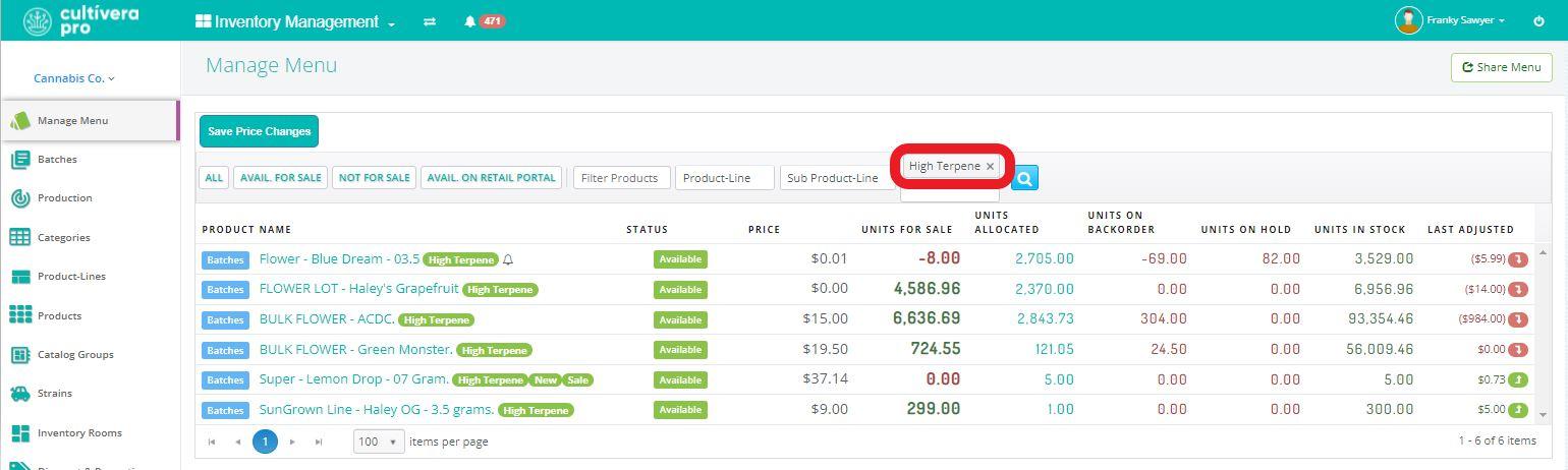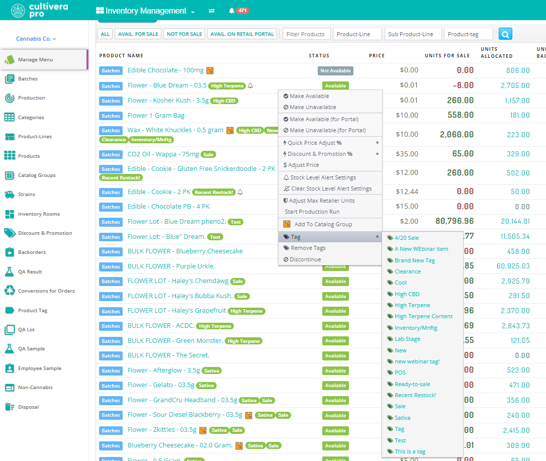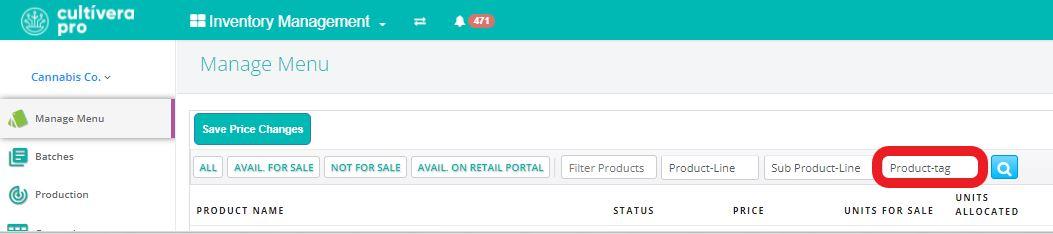 Product Tags are custom “digital labels” that can be applied to Products to make them easier to find via filters on both the Inventory Management > Manage Menu and the Sales > Inventory pages.