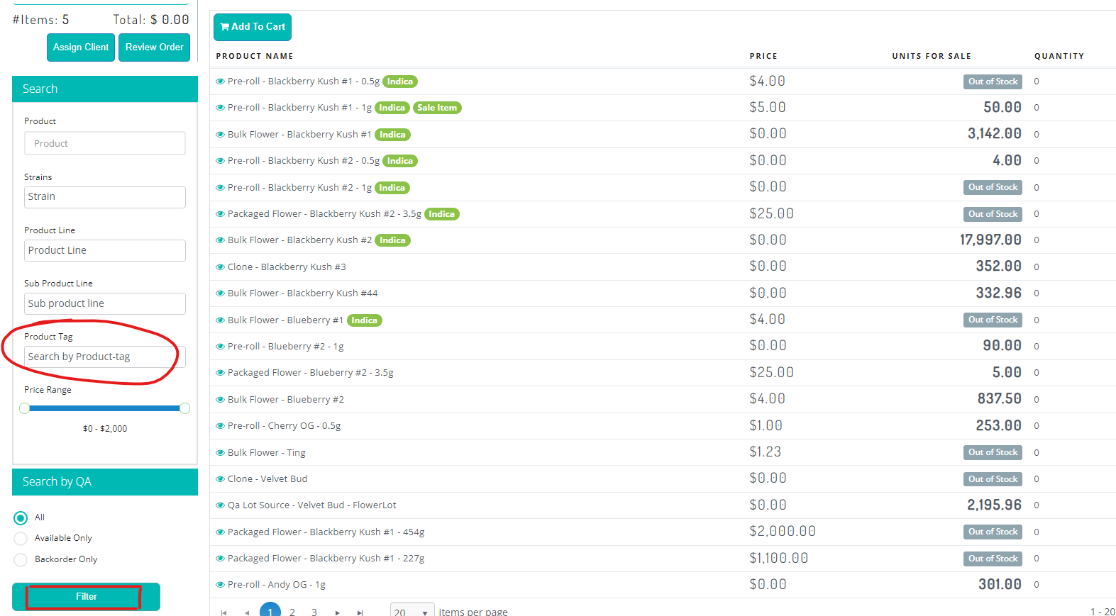 To locate any items that match a certain Product Tag, use the Product Tag filter at the top right of the screen.