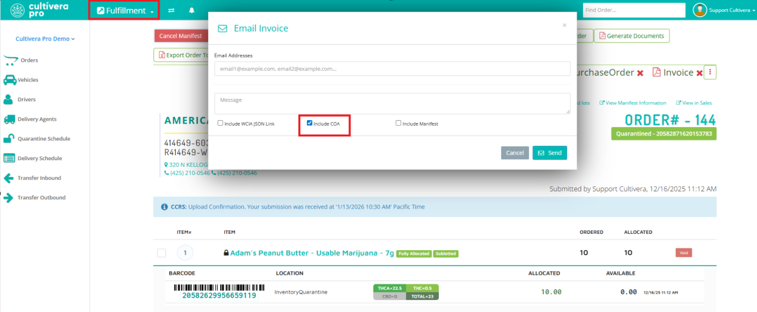 Once a COA PDF has been attached to a QA Result, you'll be able to send it to recipients via the "Email Invoice > Include COAs" on Fulfillment > Order Detail.