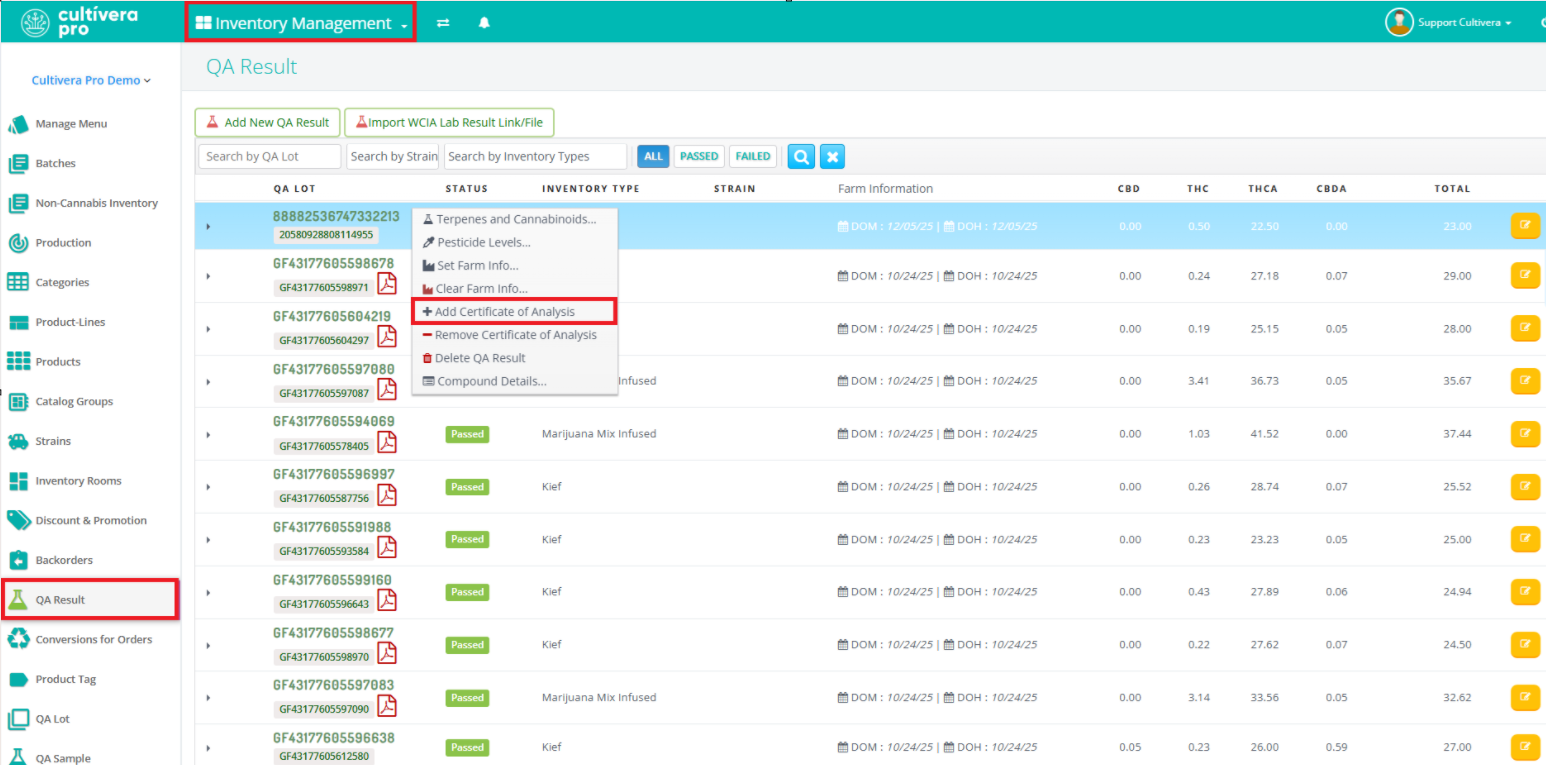 Once you have combined the intended COA PDFs, you can navigate to Inventory Management > QA Result to attach the combined COA PDF (right-click on the result and select "Add Certificate of Analysis").