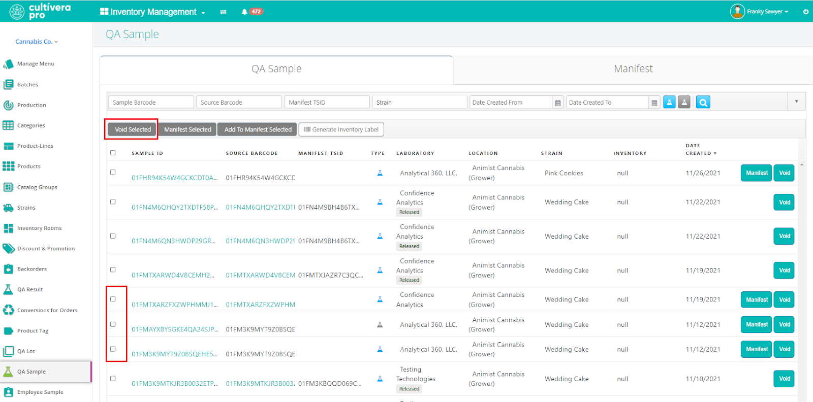 - To void more than one sample simultaneously, check the boxes next to the samples you intend on voiding and click the "Void Selected" button.