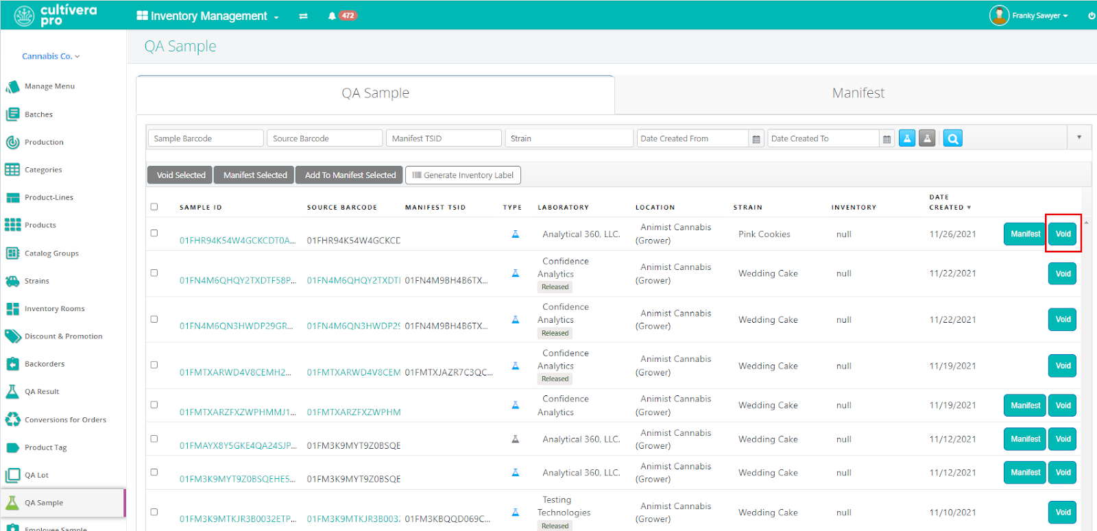 - Locate the sample you wish to void and click the “Void” button on the right side of the screen.Note: if a QA sample has already been manifested you will have to delete the manifest before you can void the QA sample. See related: "How to Cancel and/or Delete Manifests for QA Samples".