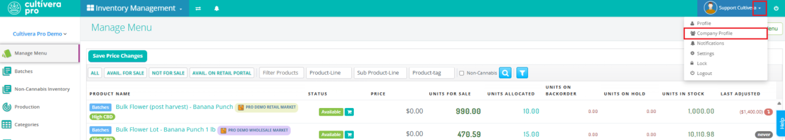 - Navigate to the Company Profile (this can be accessed from any module by clicking on the dropdown arrow next to your name in the upper right corner).