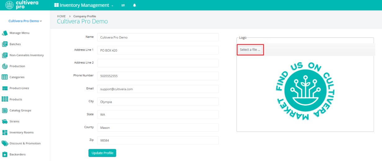 The logo that appears on your documents, such as the PO or Invoice, can be updated from the Company Profile page.