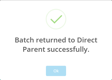 - A success message will appear once the inventory has been returned. Quantities automatically return back to the direct parent batch. Click 'Ok" to proceed.