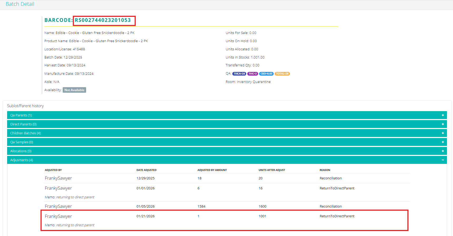 - After the return to parent is completed, the adjustment will be summarized in the direct parent's Batch Details under the "Adjustments" column that says, "Memo: returning to direct parent"