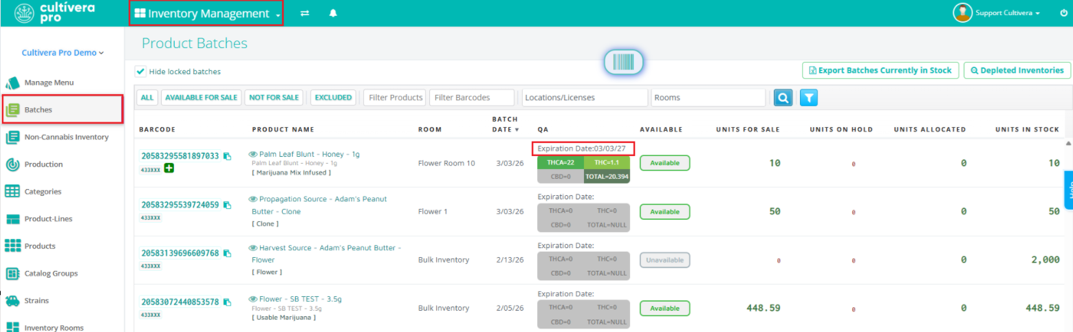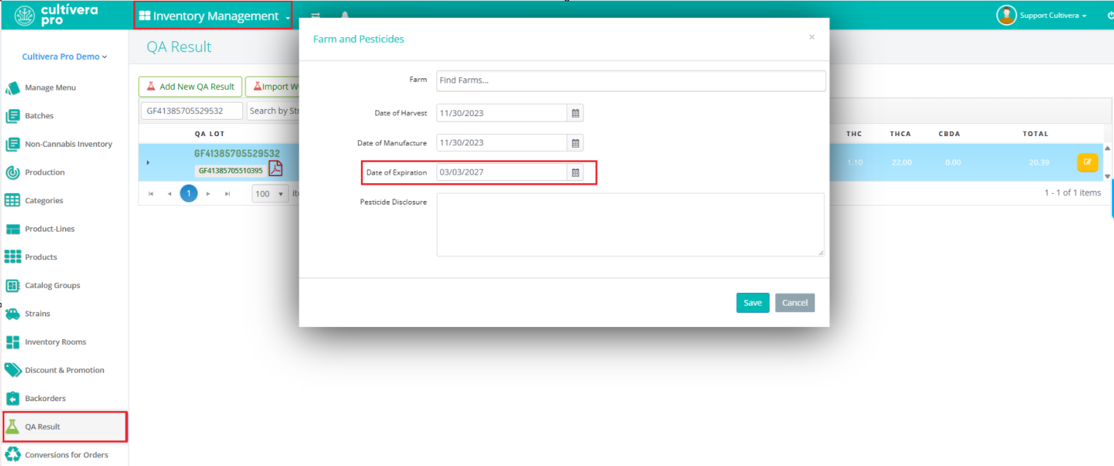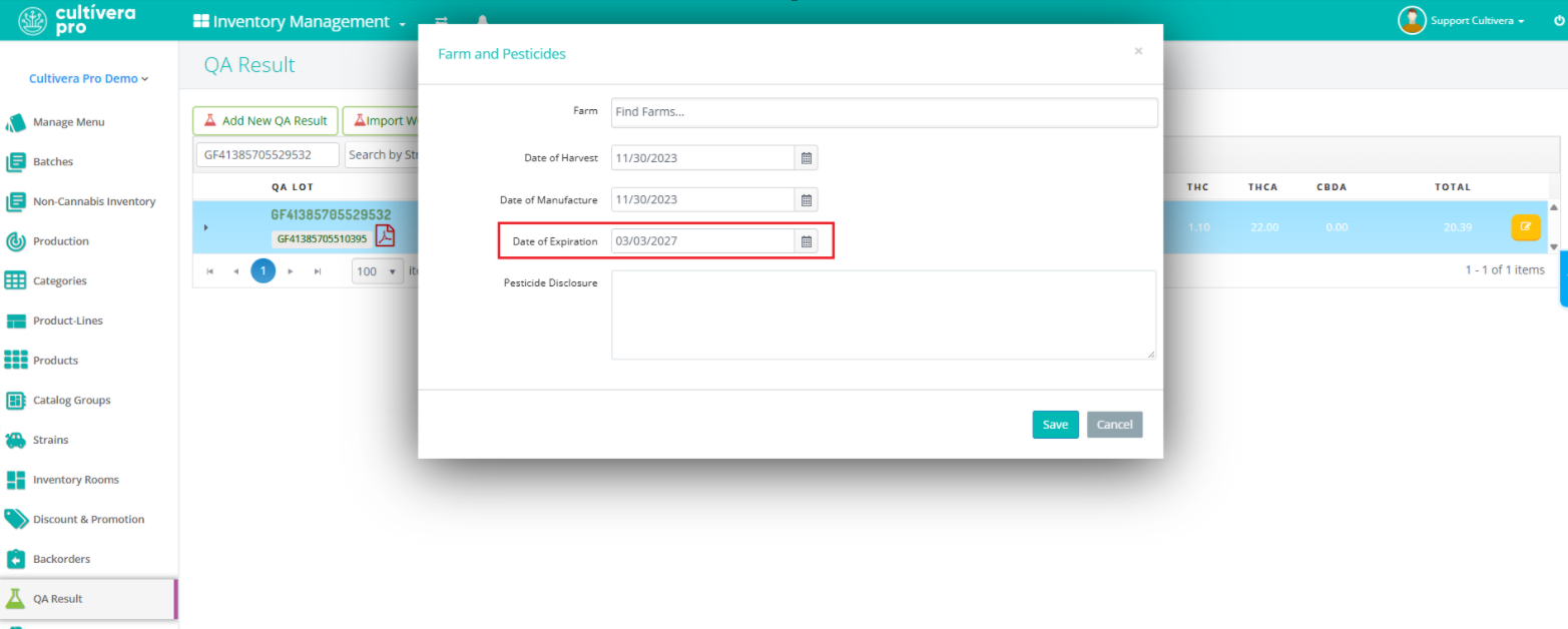 Once the result has been updated, you should see the intended 'Expiration Date' for any batches associated with the QA Result.