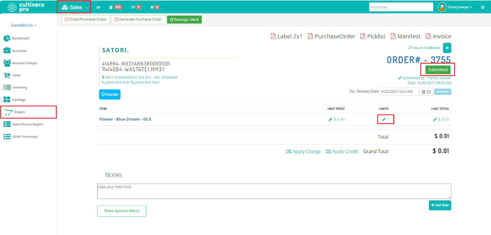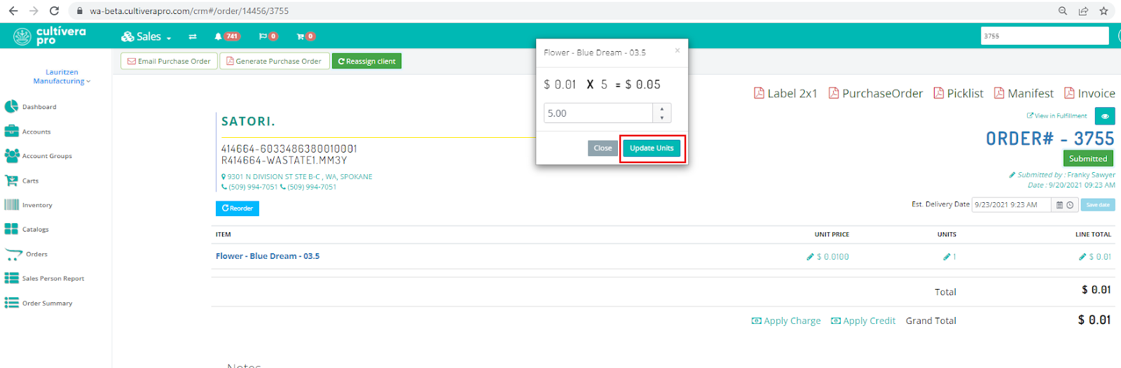 Now that the order is back to the "Submitted" status, open the order in the Sales > Orders screen and click the blue pencil icon under the "units" column to adjust unit quantities.
