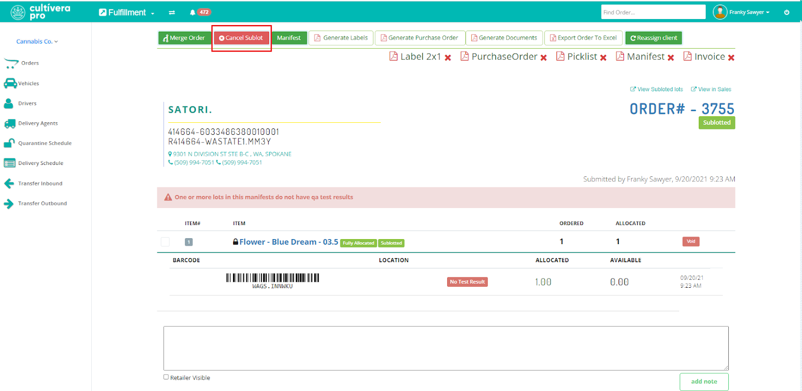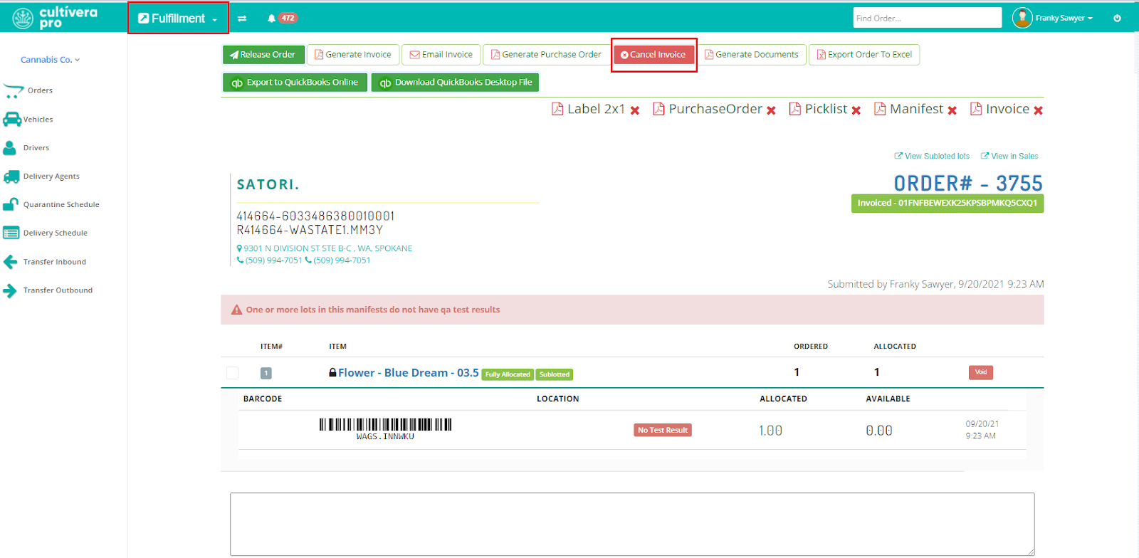 - Orders that have progressed beyond the “Submitted” status will need to have their Invoice, Manifest, and/or Sublots canceled, respectively, in the Fulfillment module, which reverts the order back to the “Submitted” status.