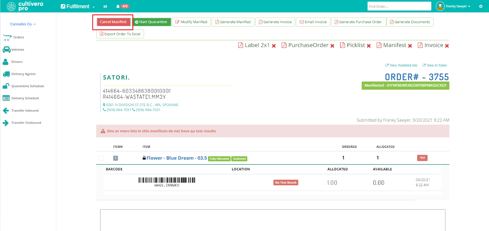 - Select “Cancel Manifest”