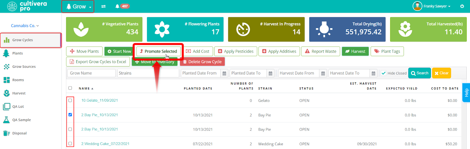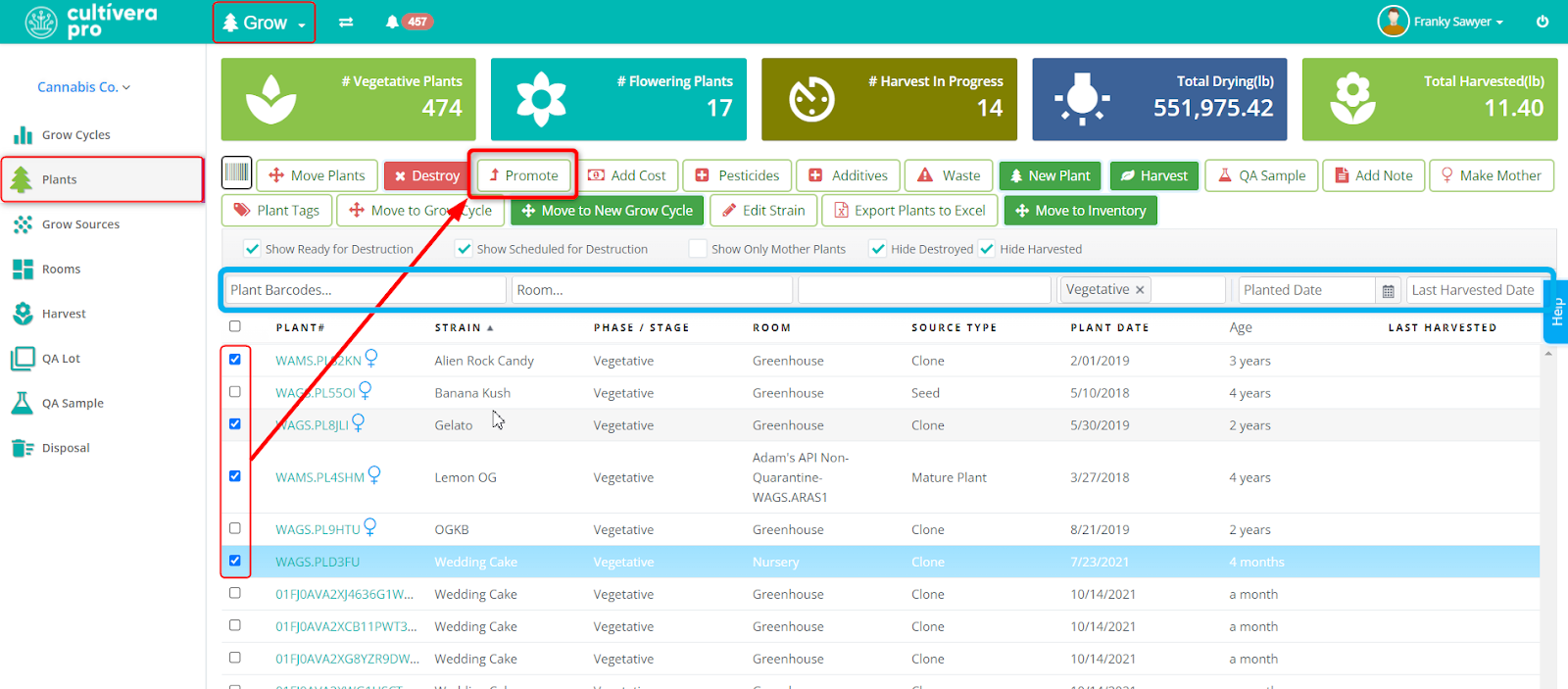 You can use any combination of the filters in the blue box to narrow things down to exactly which items you wish to promote. In the example above, you can see the “Vegetative” stage filter is used, and multiple plants of different strains are able to be selected to promote all at once.