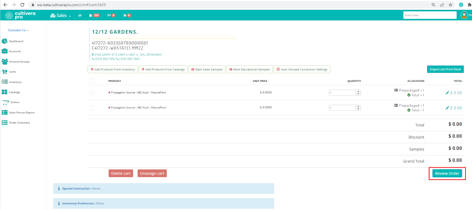 - Navigate to the Sales > Carts > Cart Detail to "Review Order".