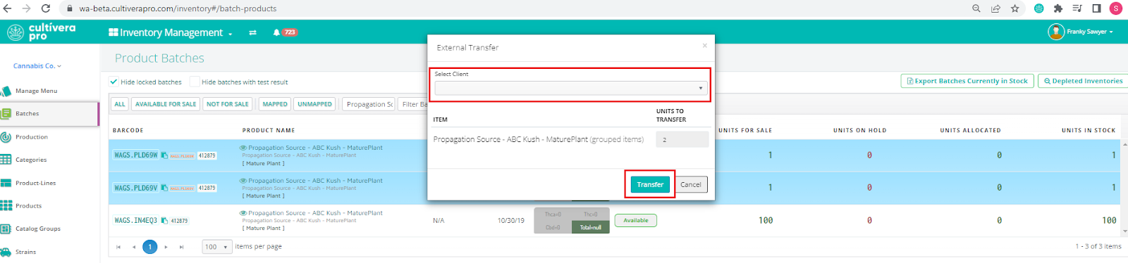 “Transfer to Internal” is utilized when transferring plants between your own licenses that are on the same Cultivera database.
