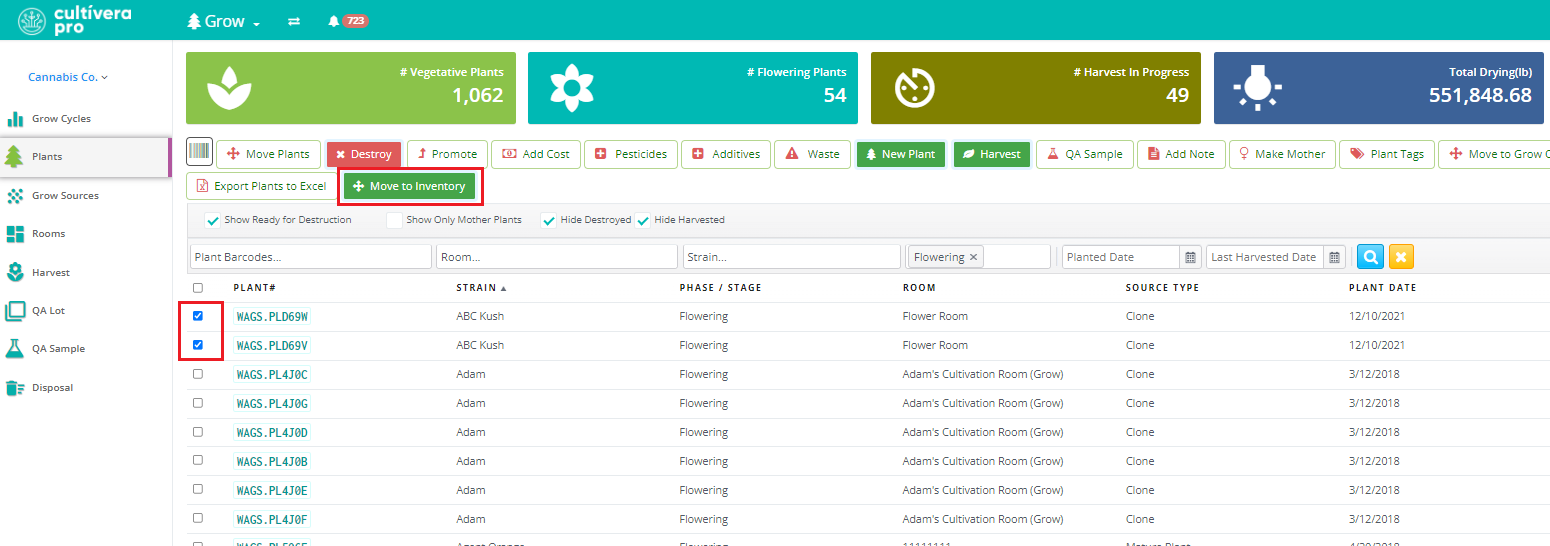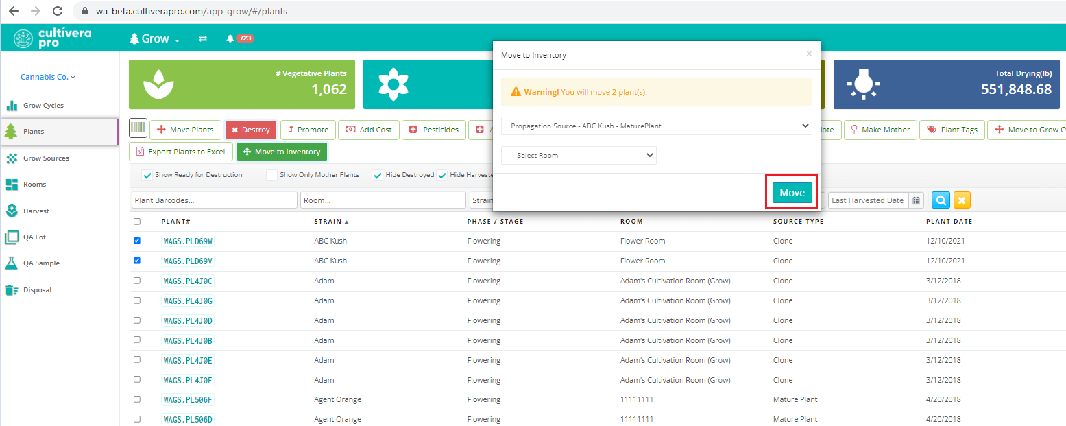 You can only successfully “Move to Inventory” for Plants of the same strain. This cannot be done for multiple strains at one time.