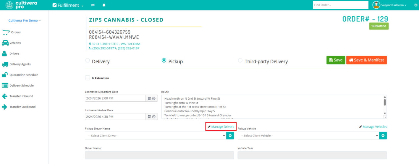 - Click on the "Manifest" button at the top of the order and note whether it will be for Delivery, Pickup, or will use a Third-Party Delivery service. The Estimated Departure and Arrival Dates need to be in the future, and the Route should fill in automatically, based on the addresses listed.